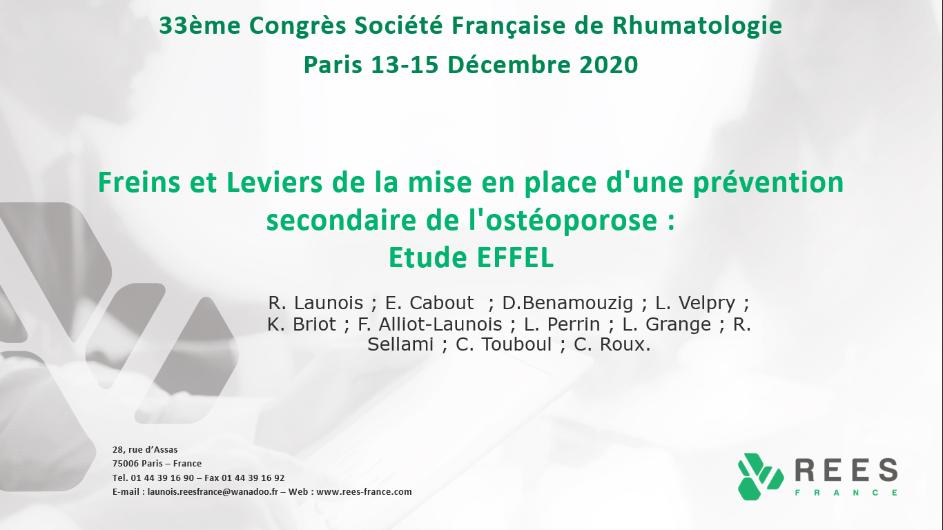 À l’occasion du 33e congrès de la Société Française de Rhumatologie qui se fera en virtuel, REES France aura l’opportunité de présenter des travaux sur les freins et leviers de la prévention secondaire de l’ostéoporose